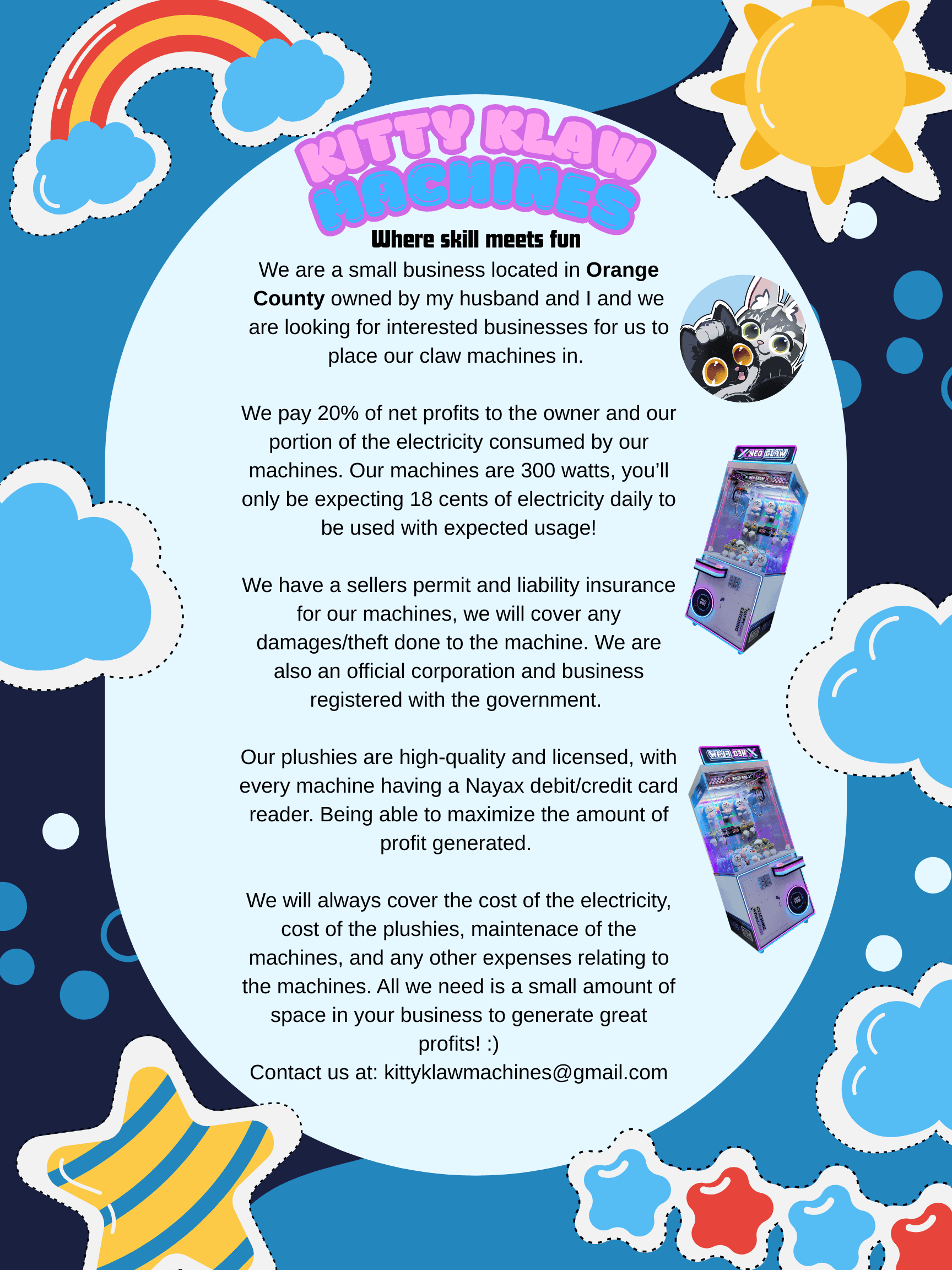 Work with Kitty Klaw to place machines in your business and earn consistent monthly income. Contact us to discuss partnership opportunities.